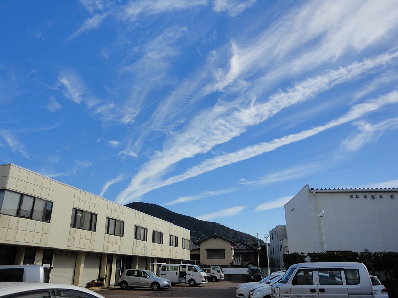 長く伸びた飛行機雲が少しずつ広がり不思議な形をしています。