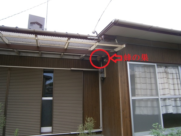 急いで確認へ行くと軒下に立派な蜂の巣が出来ていました。↓