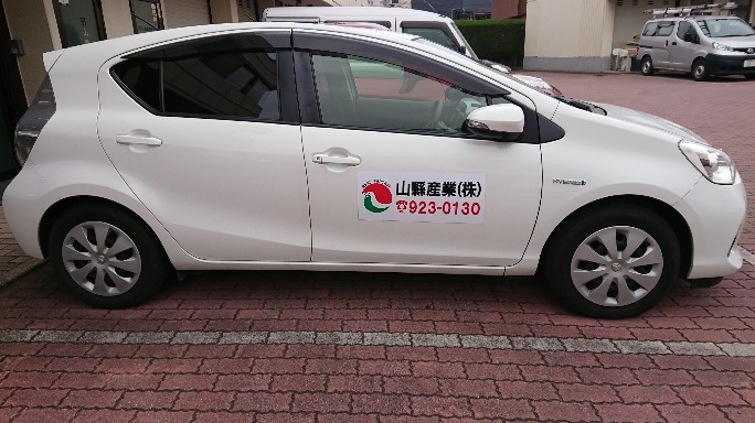 最近、社用車にこのような社名入りプレートを貼って走っております。