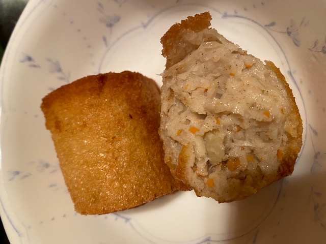 「カナッペ」とは、魚のすり身に玉ねぎ・人参・コショウを混ぜ込み、周りを薄い食パンで巻いて揚げた商品で、外はカリッと、中はふわっとした食感とのこと。